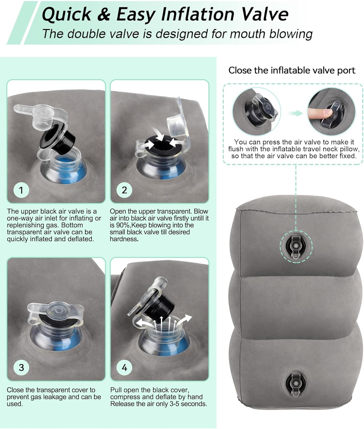 ✈️UNIQUE HUMANIZED DESIGN: This inflatable leg rest has two separate air chambers. The lower chamber for 1-level height, and the upper chamber for 2-level height. With 2-in-1 double valve, the upper black air valve is a one-way air inlet for inflating or replenishing gas. Bottom transparent air valve can be quickly inflated and deflated. What’s more, the double valve is designed for mouth blowing, It only takes about one or half minutes with a few breathes. Release the air only 3-5 seconds.