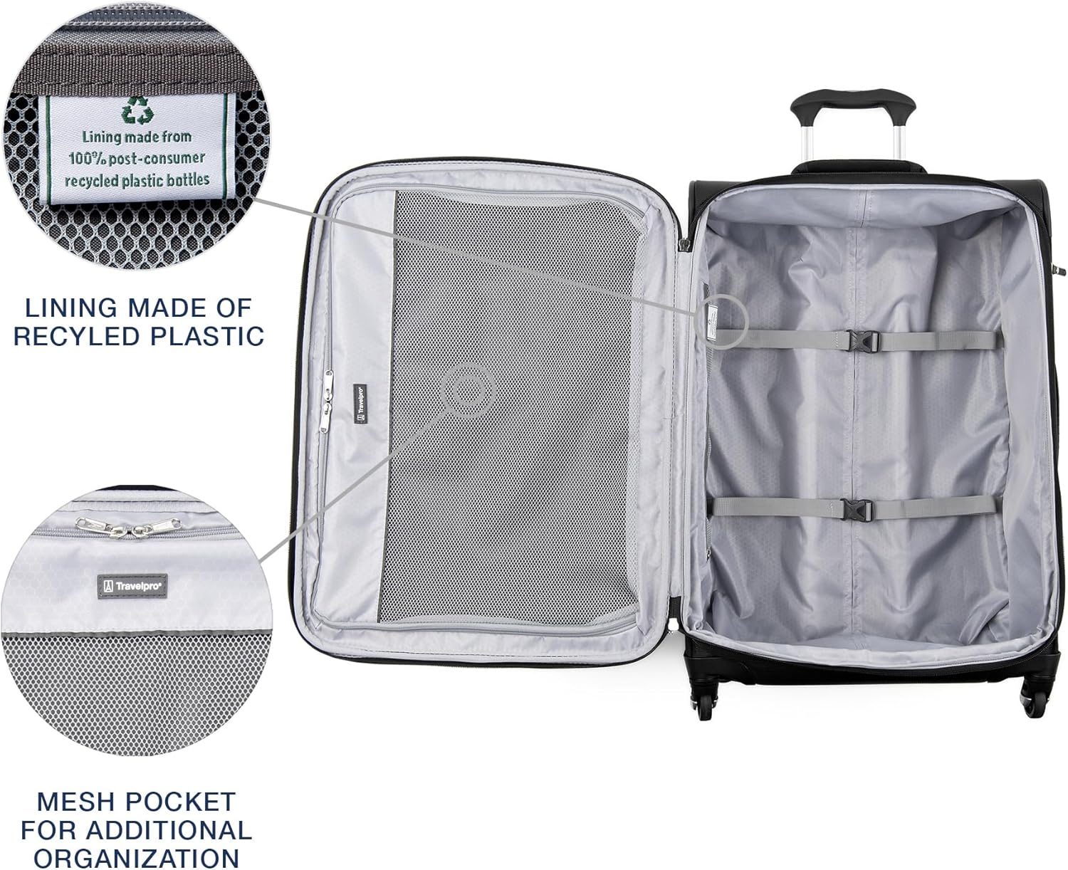 Lighten up with the Maxlite 5 25 inch Expandable Spinner, the lighter-weight, ultra-durable, soft-sided spinner suitcase in a checked baggage size designed to accommodate medium–length and longer trips. Enjoy an easy, comfortable glide thanks to the 2-position adjustable PowerScope Lite handle with patented Contour Grip and 4-wheel 360 degree rotating spinners, and stay organized with a convenient front pocket, full-length interior lid pocket, side accessory pocket and roomy interior with adjustable hold-down straps. A high-tensile-strength expandable zipper maximizes packing space for impressive flexibility. Backed by a new and expanded Trusted Traveler Promise—for worry-free warranty coverage from Travelpro.