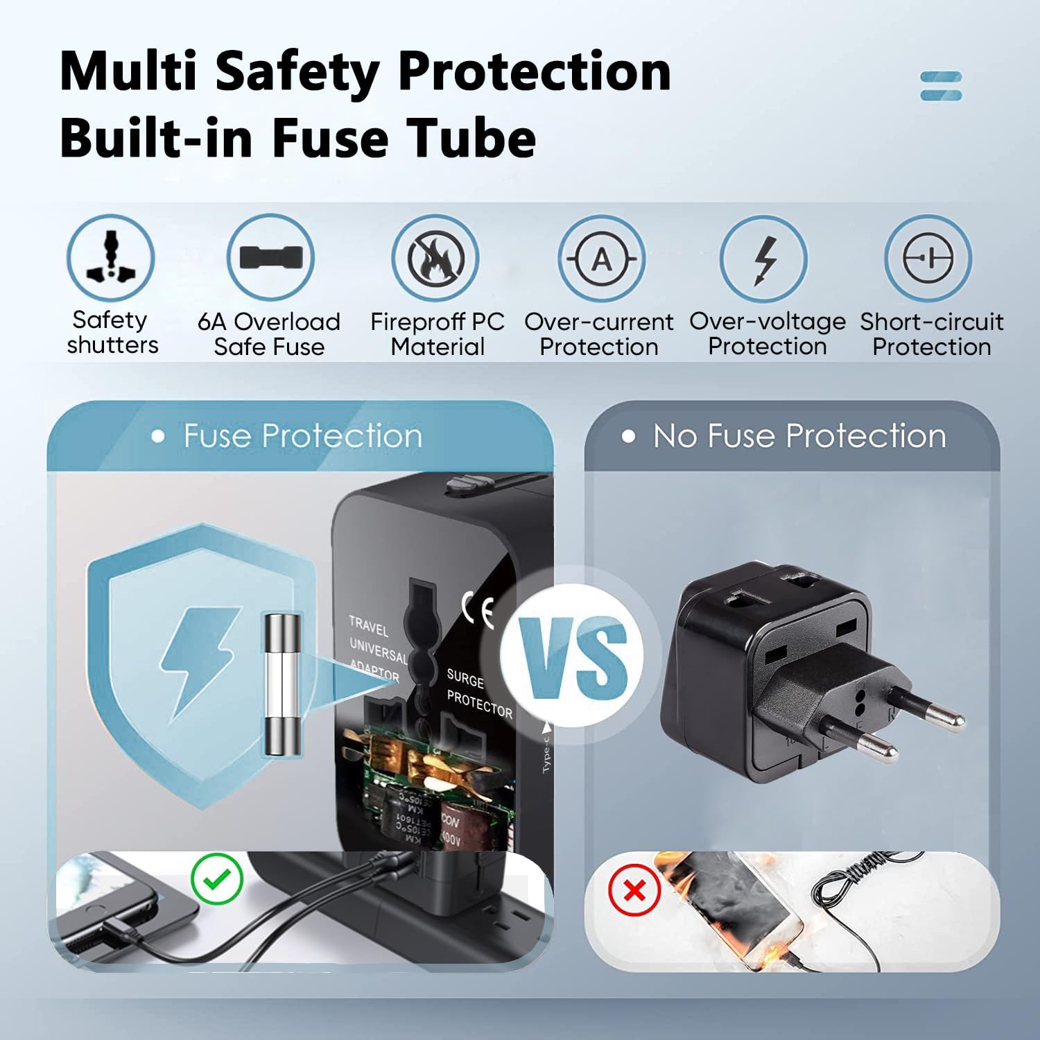 Multi Safety Protection: MINGTONG Travel adapter built-in 6.3A safe fuse protect, Safety Shutters, LED Power Indicator, Fireproof material. Provide over-current, over-voltage, Short-circuit Protection, surge protection.