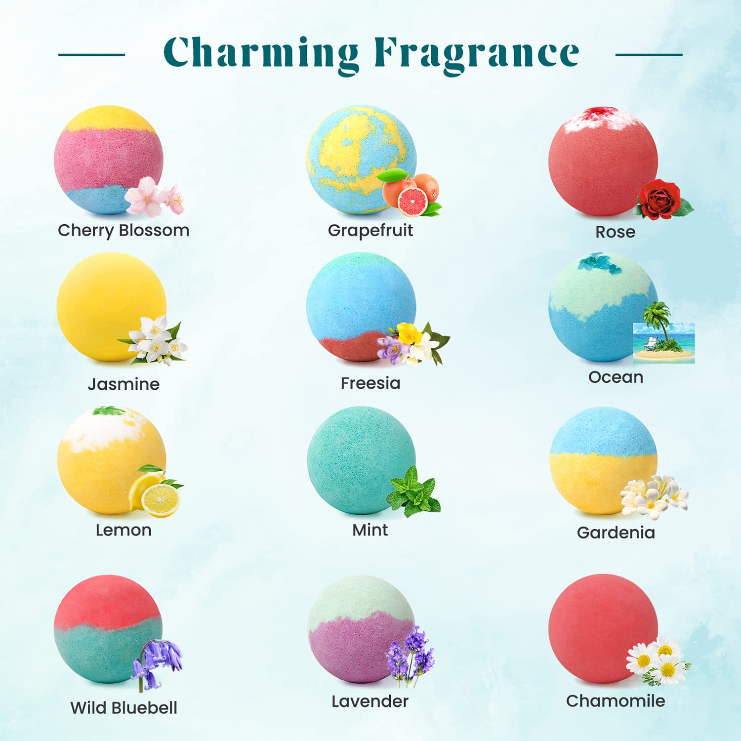 [12 Fragrances] 12 bath bombs, each with a unique fragrance. Rose, jasmine, cherry blossom, lavender, mint, chamomile, etc. We have selected the most popular 12 fragrances to provide a varied and luxurious experience. Tired out after a long business trip? Use Zenbombs!