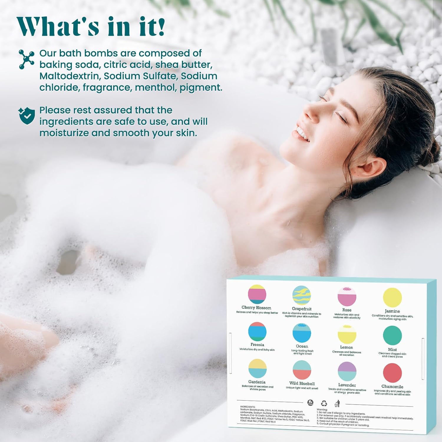 [Natural Ingredients] Our bath bombs are composed of baking soda, citric acid, shea butter, Maltodextrin, Sodium Sulfate, Sodium chloride, fragrance, menthol and pigment. The ingredients are safe to use, and will moisturize and smooth your skin. Our manufacturer has been assessed by the NSF and complies with the Cosmetic Good Manufacturing Practices from the U.S Food and Drug Administration(FDA).