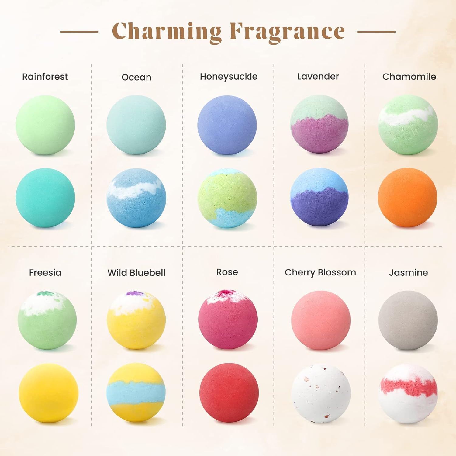 Variety of Choices: 20 bathbombs in 10 different scents; And we has been assessed by the NSF and complies with the Cosmetic Good Manufacturing Practices from the U.S Food and Drug Administration(FDA);