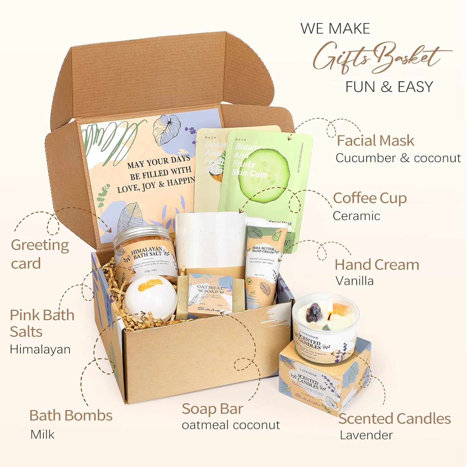 Ceramic Coffee Mug: Crafted from high-quality ceramic, it feels smooth to the touch, making it perfect for starting the day with a morning coffee or tea.Lavender Crystal Aromatherapy Candle: Made with lavender essential oil, light it during a bath for a peaceful experience or to relax before bed.Himalayan Pink Bath Salt: Pure and natural Himalayan pink salt, rich in minerals such as magnesium, calcium, and potassium, adds a spa-like touch to your bath when dissolved in water.Milk Bath Bomb: Infused with milk protein, it releases a light fragrance to enhance your bathing experience.Oatmeal Coconut Soap: Ideal for daily facial or body cleansing, leaving you with a refreshing and comfortable feeling.Vanilla Hand Cream: With its warm vanilla scent, apply it anytime, anywhere to keep your hands soft and smooth.Cucumber & Coconut Mask: Hydration made easy!Large Greeting Card: A beautifully designed card with heartfelt wishes, included in the gift set, to express care and warm sentiments.