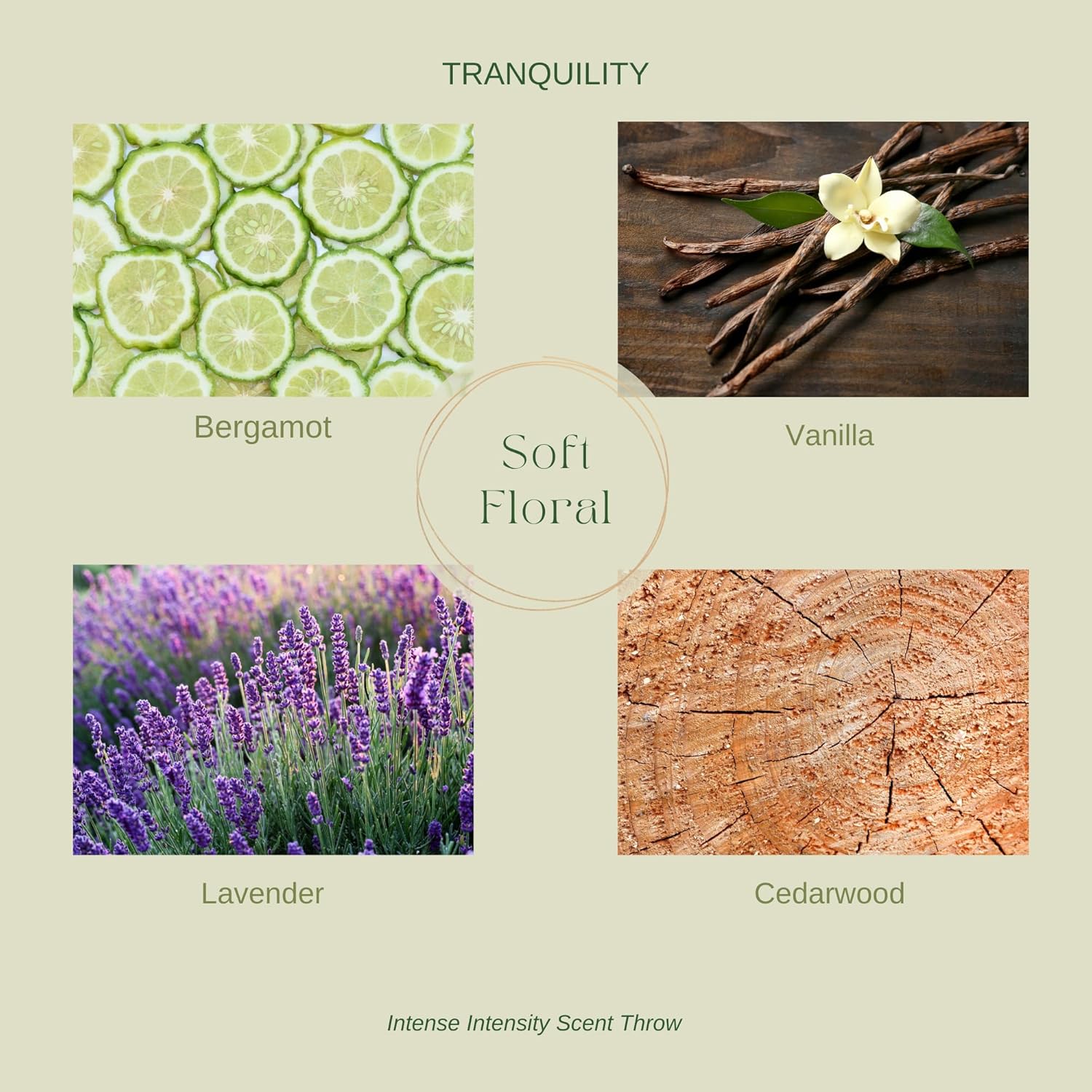 TRANQUILITY: A soothing scent that combines the calming essence of lavender, jasmine, and coconut water, known for their insomnia-easing properties. Sparkling top notes of bergamot soothe anxiety while comforting base notes of vanilla and cedar reduce tension. Enhanced with our sleep complex, this fragrance promotes a restful night’s sleep.