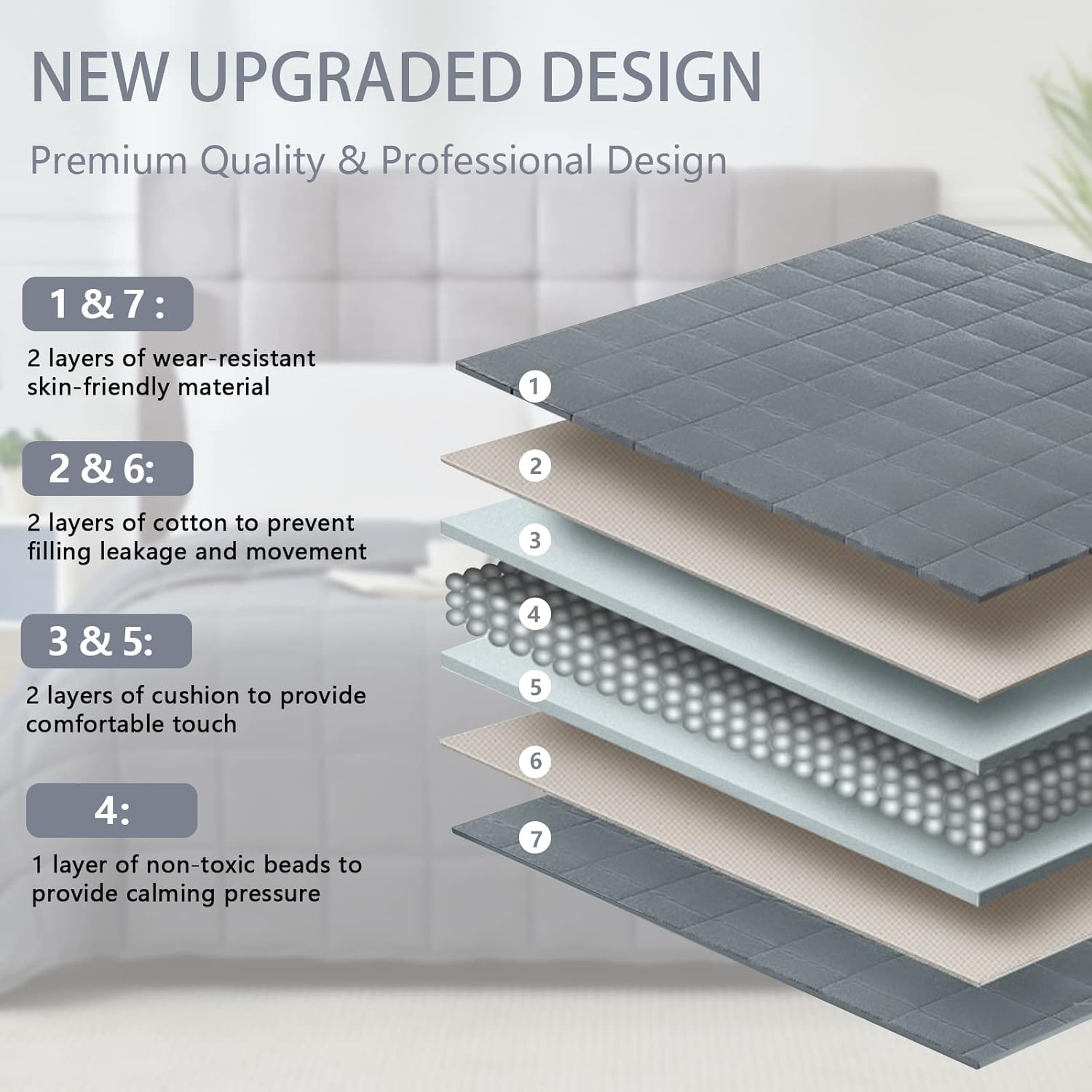 MATERIAL FABRIC: The material of weighted blanket is microfiber polyester, which is stronger, more elastic & comfortable. The heavy blanket contains environmentally friendly glass beads, which are breathable & tasteless.